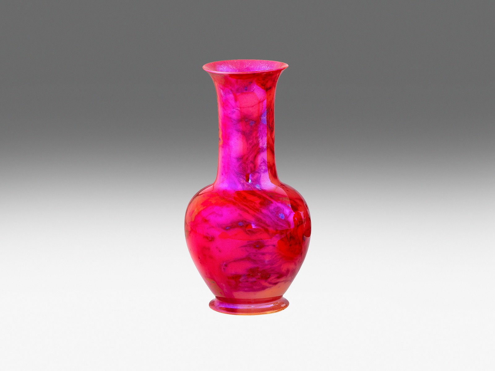 Zsolnay díszváza Korongozott és kézzel formázott fehércserép. Felületén többrétegű, márványozott, vörös eozinmázakkal festve és transzparens (tükörfény hatást kiváltó) mázzal borítva. Alján jelzett: eozinnal bélyegzett öttorony és Zsolnay, Pécs, alatta Ma