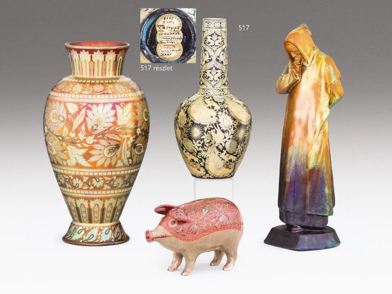 Kikiáltási ár: 36 000 FtFehércserép, plasztikus fülekkel. Felületén színesen festett alföldi életkép. Dekorterv: Pálinkás Béla, 1900 körül. Alján jelzett: masszába nyomott Fischer Emil Budapest és 406 formaszám, valamint máz alatt bélyegzett márkajelzés és Made in Hungary. Fisch