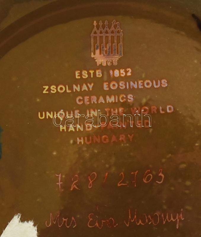 Zsolnay eozin mázas váza, színes virág díszítéssel. Felületén többrétegű fémes fényű színes eozinmázakkal festett, sötét alap felett fémlüszteres virágmintákkal. Kézzel festett, jelzett, hibátlan 30 cm