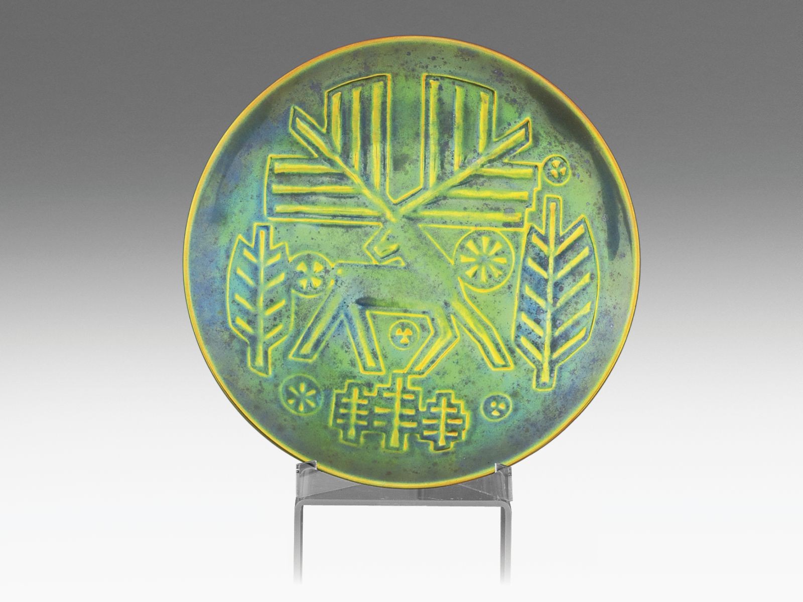 Többrétegű, zöld eozinmázzal festett porcelán. T. Surányi Anna saját kezű munkája, hátoldalán bekarcolt, datált művészjelzéssel: Tsa, 1988. IV. 25. Jelzett: eozinnal bélyegzett márkajelzés. Zsolnay-gyár (Pécsi Porcelángyár), Pécs, 1988. Átm.: 21 cm Analóg