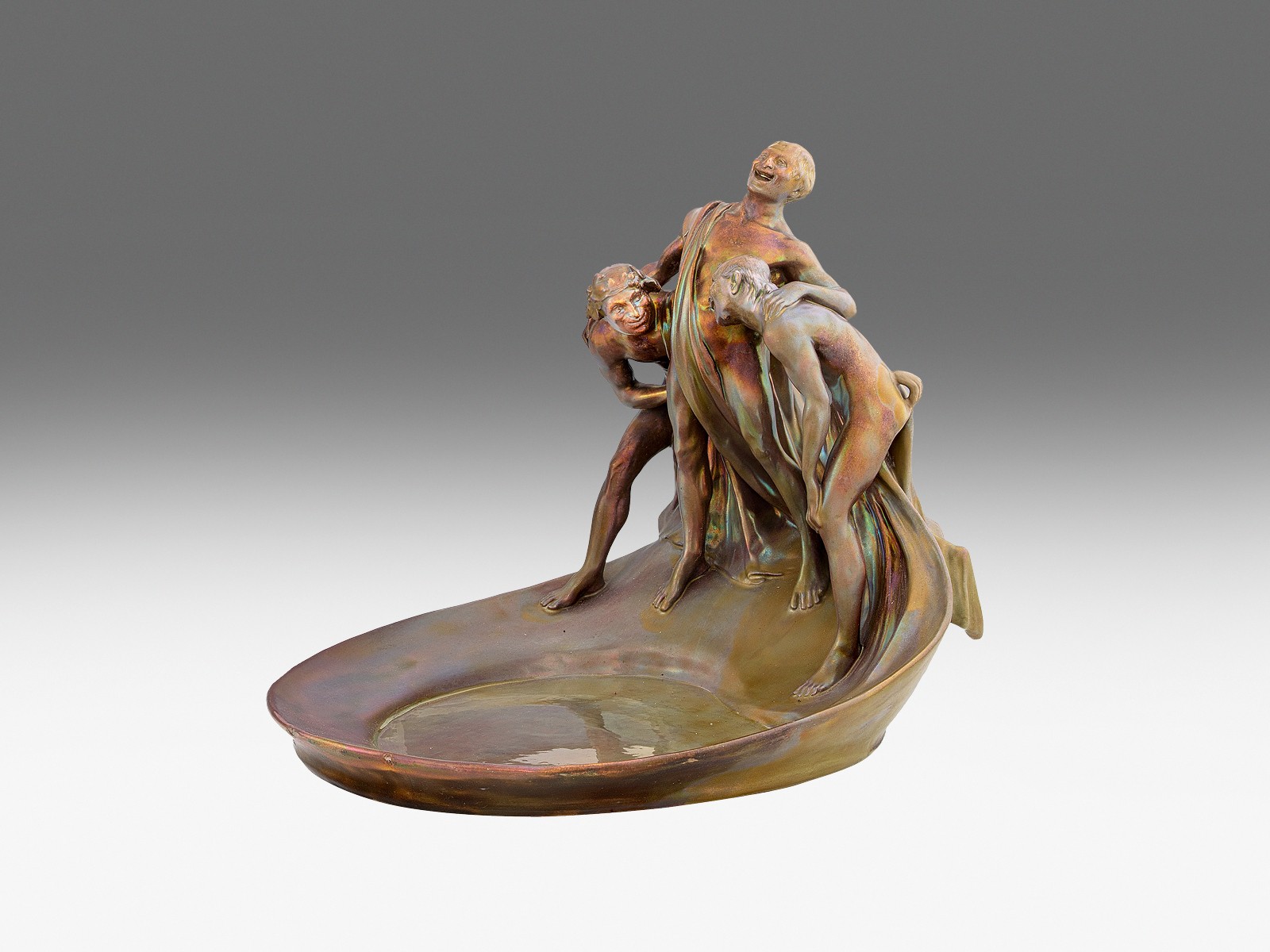 Zsolnay figurális dísztál Formába préselt és kézzel formált részekből összeállított kínálótál, peremén bacchanália jelenettel. Savmaratott felületén többrétegű, zöldes eozinmázakkal festett. A figurákon apróbb restaurálások. Formaterv: Apáti Abt Sándor, 1