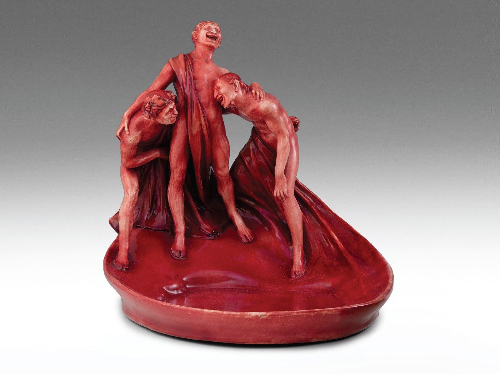 Formába préselt és kézzel formált részekből összeállított kínálótál, peremén bacchanália jelenet. Felületén többrétegű, transzparens és vörössel festett eozinmázak.