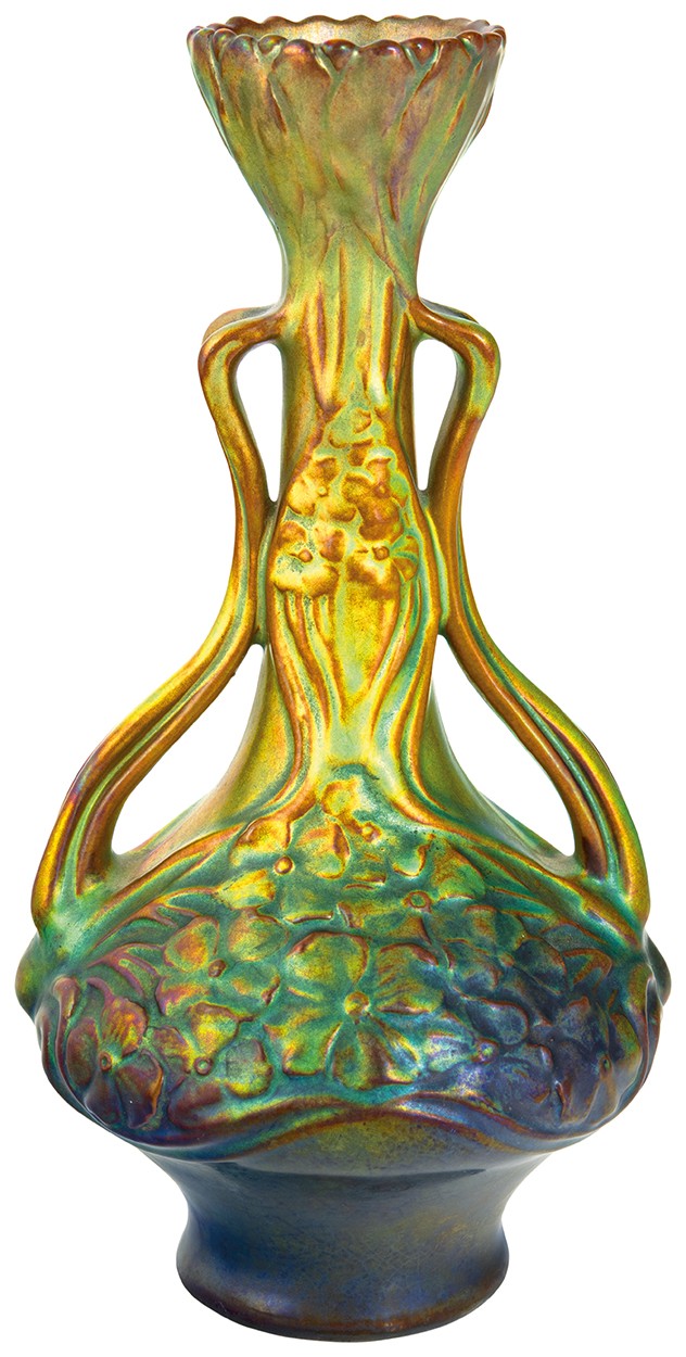 67. tétel:ZSOLNAY Váza, virágos, rovátkolt díszítéssel, 1903, FORMATERV: Apáti Abt Sándor