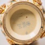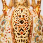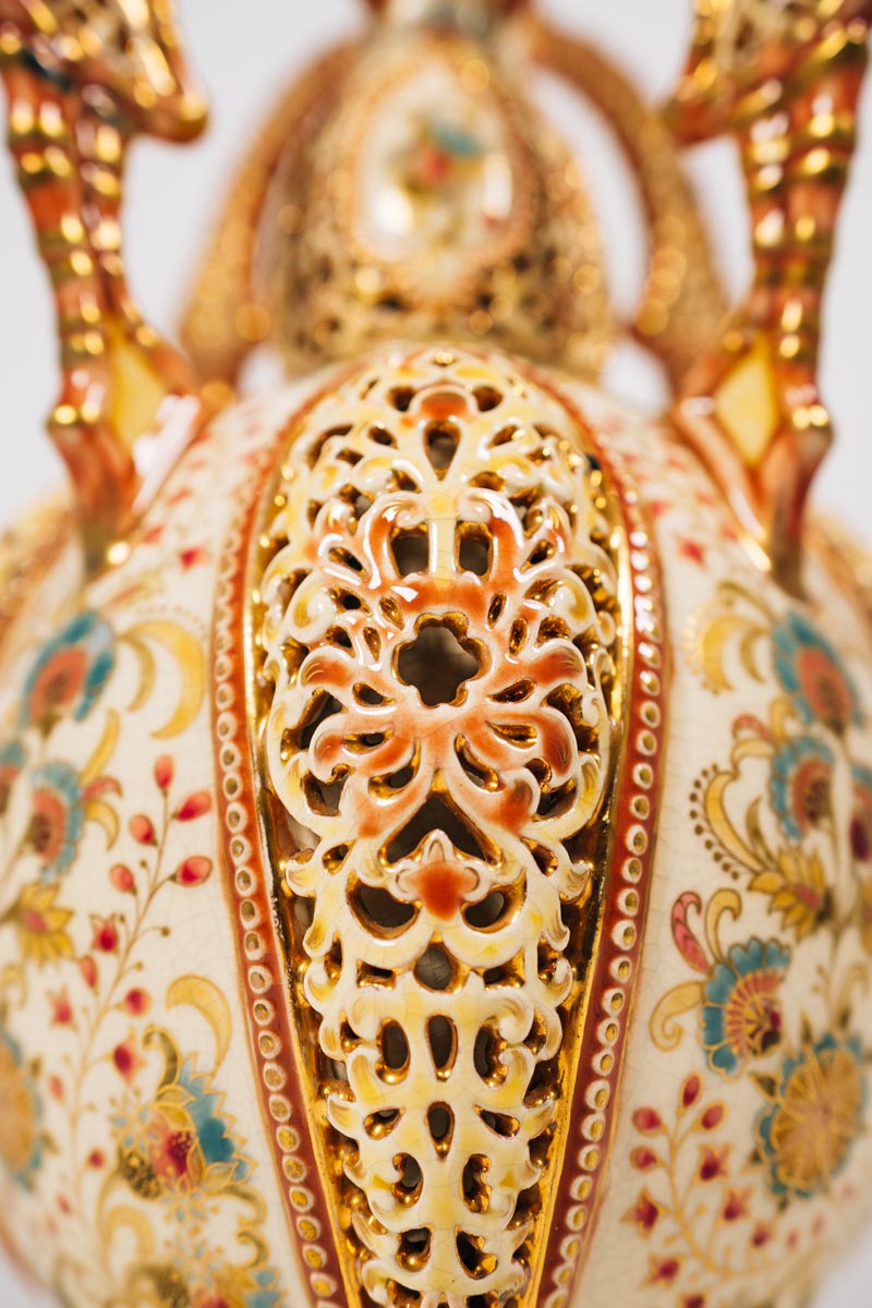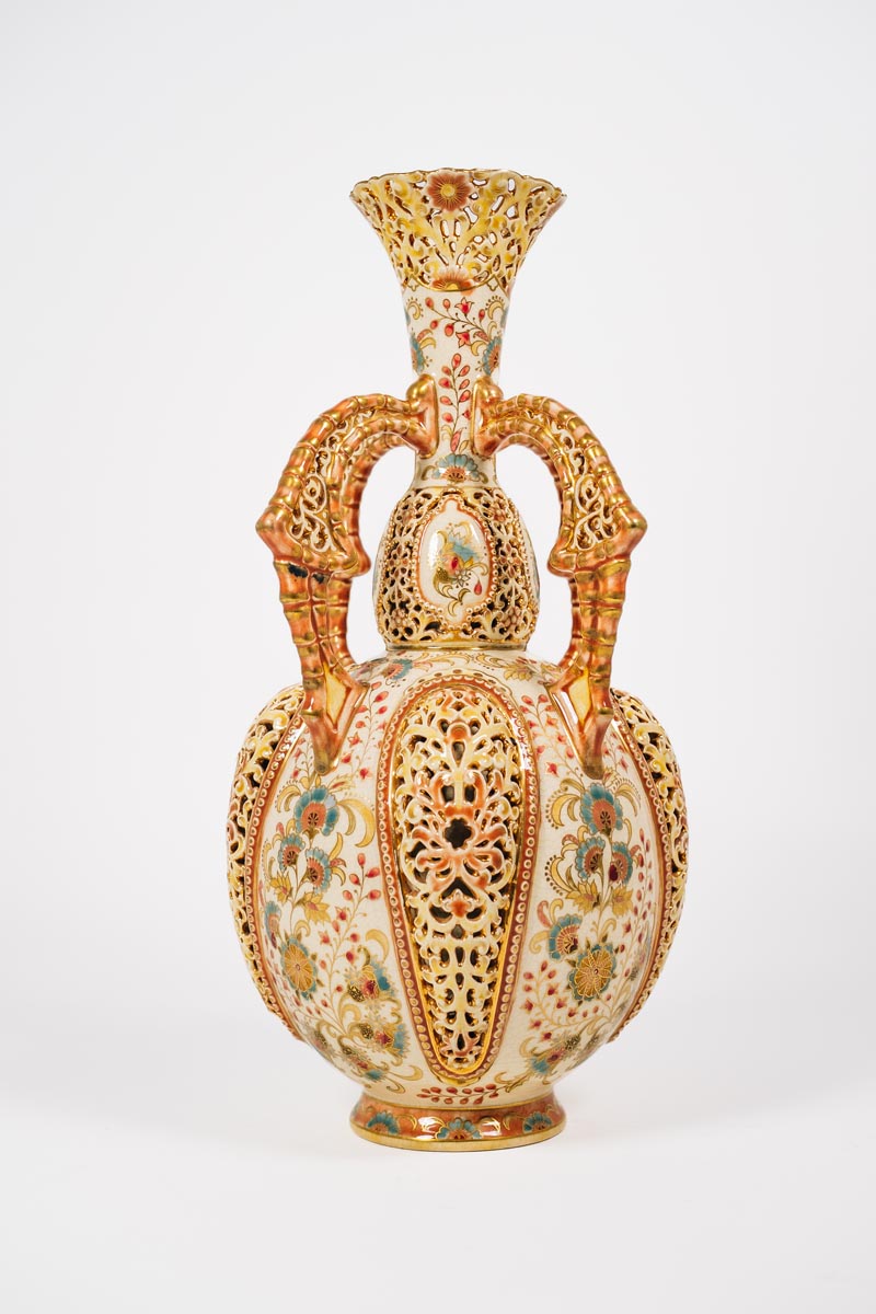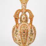 Ár: 120 000 FtZsolnay manufaktúra, 40 x 20 cm, Porcelánfajansz, plasztikus fülformázás, áttört talpazat, kecses formakorongozás, orientális motívumokkal díszfestve, 1885-1890