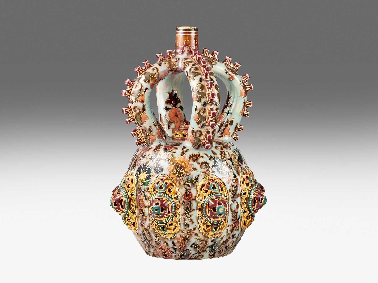 Formába öntött porcelánfajansz, áttört, plasztikus elemekkel (ún. koronás füllel) kialakítva. Trachitopál alapmázon magastüzű, színes mázakkal festett keleties virágdekor, lüsztertechnikával és kontúraranyozással díszítve. Feltehetően Sikorski Tádé forma