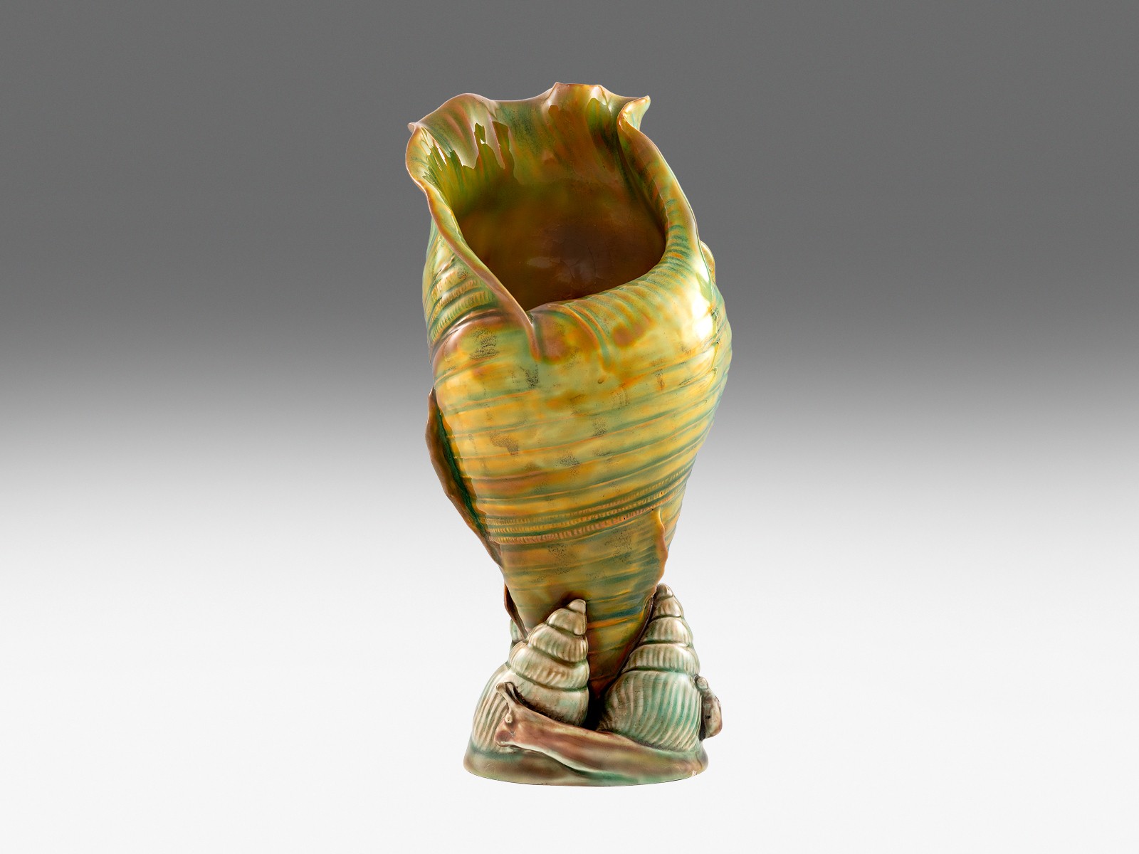 Zsolnay kagylóváza csigákkal Formába öntött keménycserép, többrétegű, irizáló felületén szeladonmázzal borítva. Három kisebb csigaház tartja a kagyló formájú díszvázát. Talpán alul kisebb gyári tűzrepedés, talpperemén apró restaurálás. Alján jelzett: mass