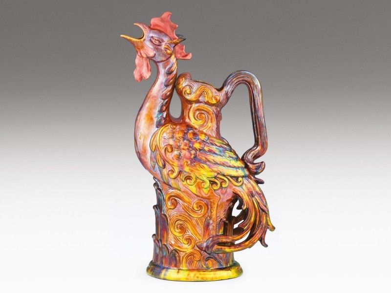 Porcelánfajansz, színes eozinmázakkal festett. Főnix formájú díszkanna, korábbi előkép alapján – a drezdai kincstárban őrzött, XVI.