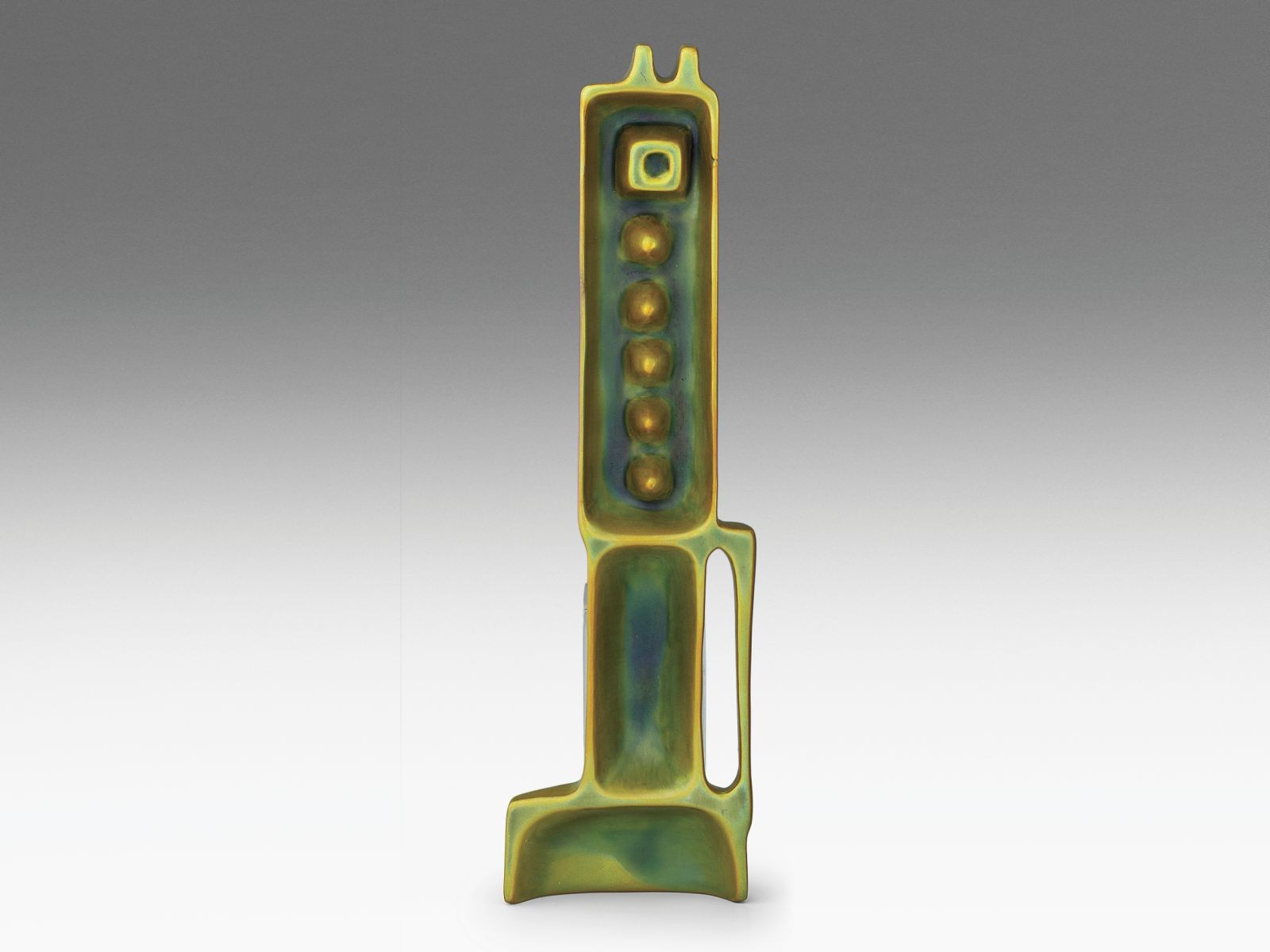 Kikiáltási ár: 360 000 FtFormába öntött fehércserép, felületén selymesfényű, többrétegű, színes eozinmázakkal festve. Formaterv: Sinkó András, 1935. Alján jelzett: bélyegzett hárompajzsos öttornyos márkajelzéssel. Zsolnay, Pécs, 1930-as évek vége. M.: 16 × 8,5 × 9 cm
