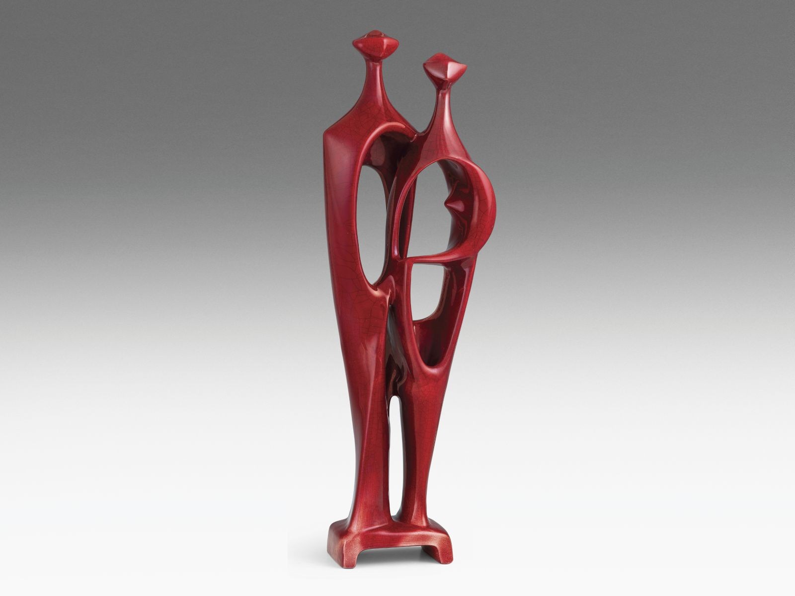 Formába öntött, piros eozinmázakkal festett porcelán. Kis szériás, sorozatgyártásban nem készült darabok egyike. A gyárban eozinból készült figurák legnagyobbika. Egyik figura nyaka restaurált.