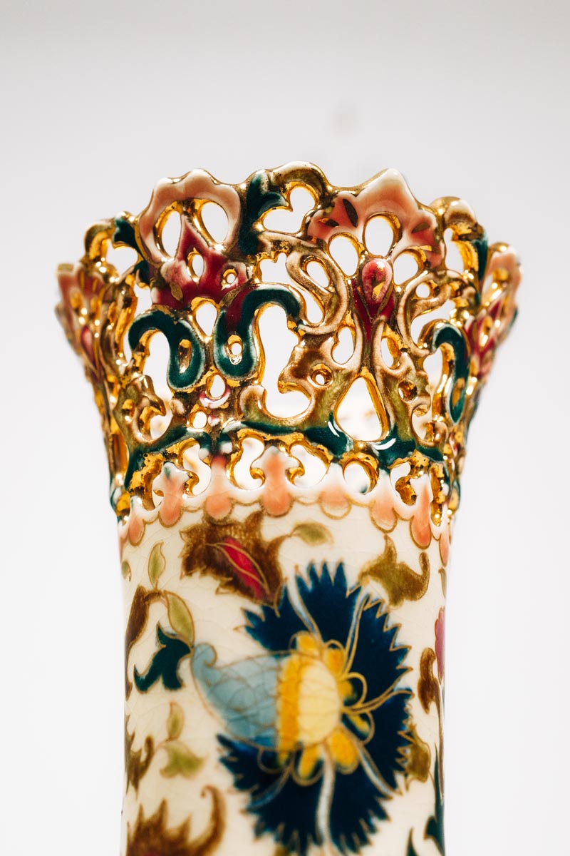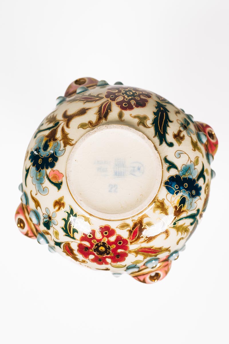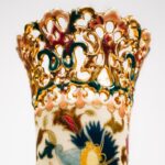 Ár: 60 000 FtZsolnay manufaktúra, 11 x 17 x 11 cm, Porcelánfajansz, korongozással formázott, áttört és diszfestéssel gazdag, 1873 - 1882