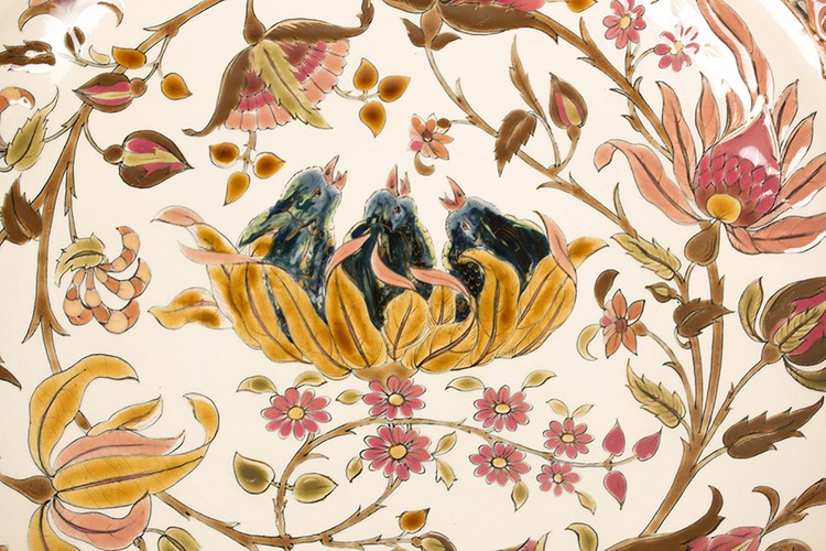 Zsolnay: Madaras dísztányér, 1880 körül porcelán, mázas 45 cm Jelzés: TJM családi márkajelzés, Zsolnay Pécs mélynyomás, Made in Hungary, fazonszám: 1254