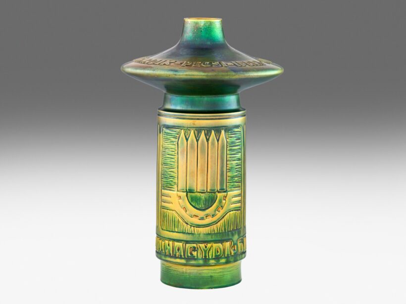 Formába öntött porcelánfajansz, savmaratott felületén márványozott, zöld eozinmázakkal festve. Oldalán reliefszerűen kidomborodó, szögletes mezőkben Pécs város és a Zsolnay-gyár jelképeivel, ill. ‚Nagydíj’ felirat, valamint nyakán: ‚Harmadik Pécsi Ipari V