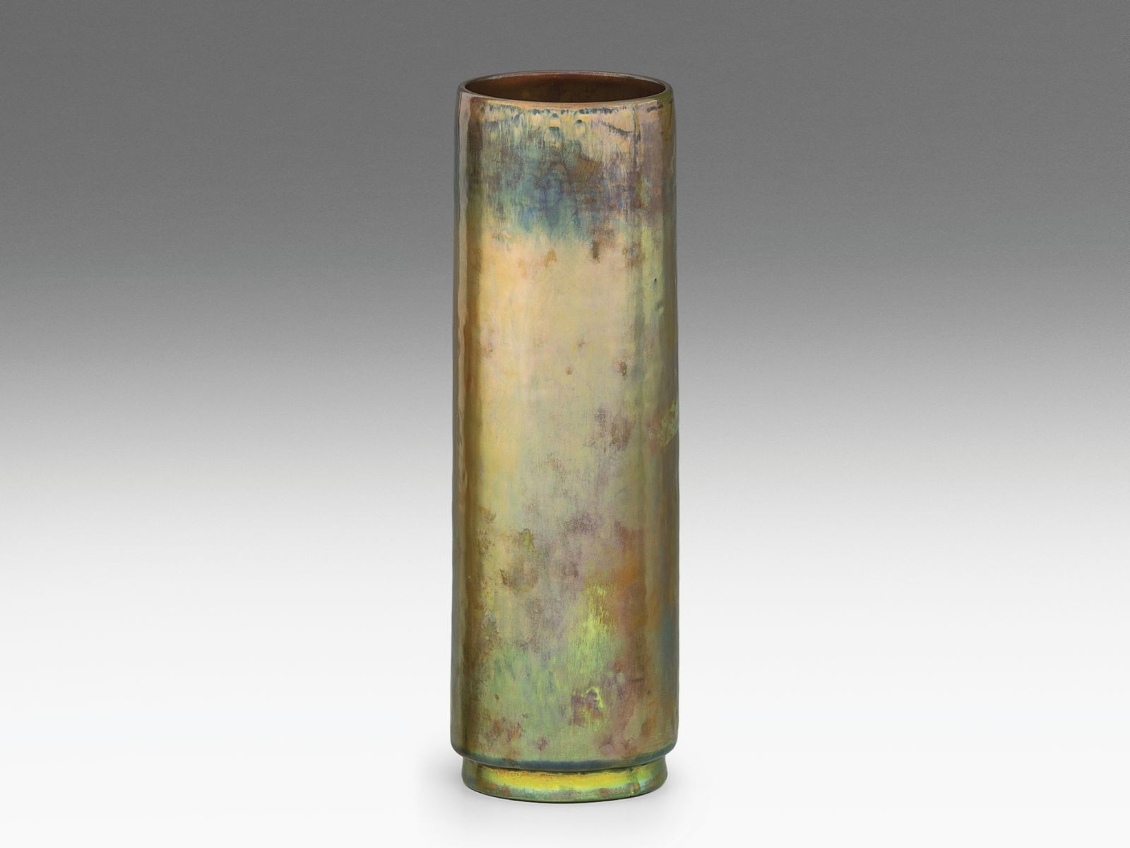 Kikiáltási ár: 380 000 FtFormába öntött fehércserép, felületén selymesfényű, többrétegű, színes eozinmázakkal festve. Formaterv: Sinkó András, 1935. Alján jelzett: bélyegzett hárompajzsos öttornyos márkajelzéssel. Zsolnay, Pécs, 1930-as évek vége. M.: 16 × 8,5 × 9 cm
