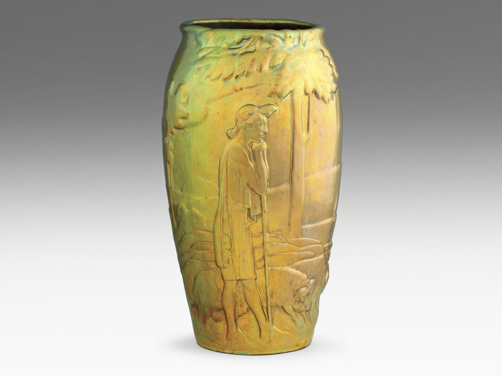 Zsolnay padlóváza, merengő pásztorlegénnyel