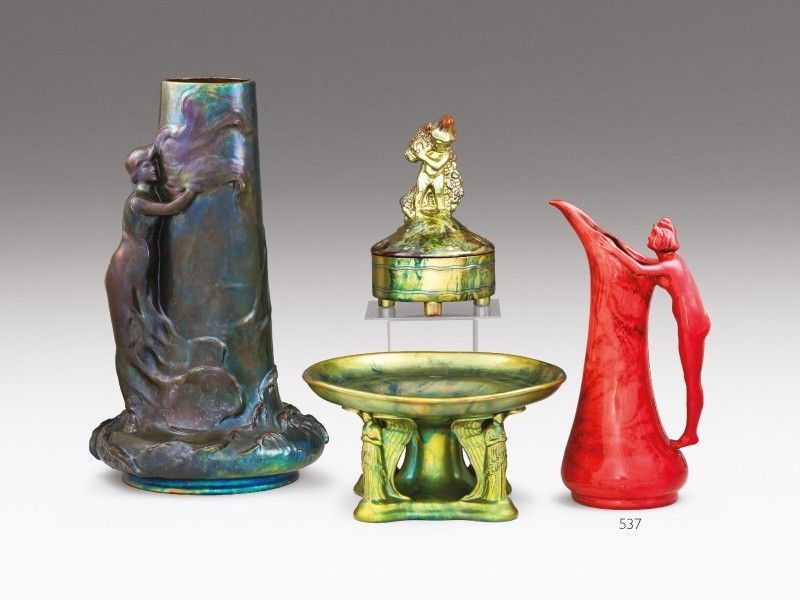 Kikiáltási ár: 50 000 FtFormába öntött fehércserép, felületén selymesfényű, többrétegű, színes eozinmázakkal festve. Formaterv: Sinkó András, 1935. Alján jelzett: bélyegzett hárompajzsos öttornyos márkajelzéssel. Zsolnay, Pécs, 1930-as évek vége. M.: 16 × 8,5 × 9 cm