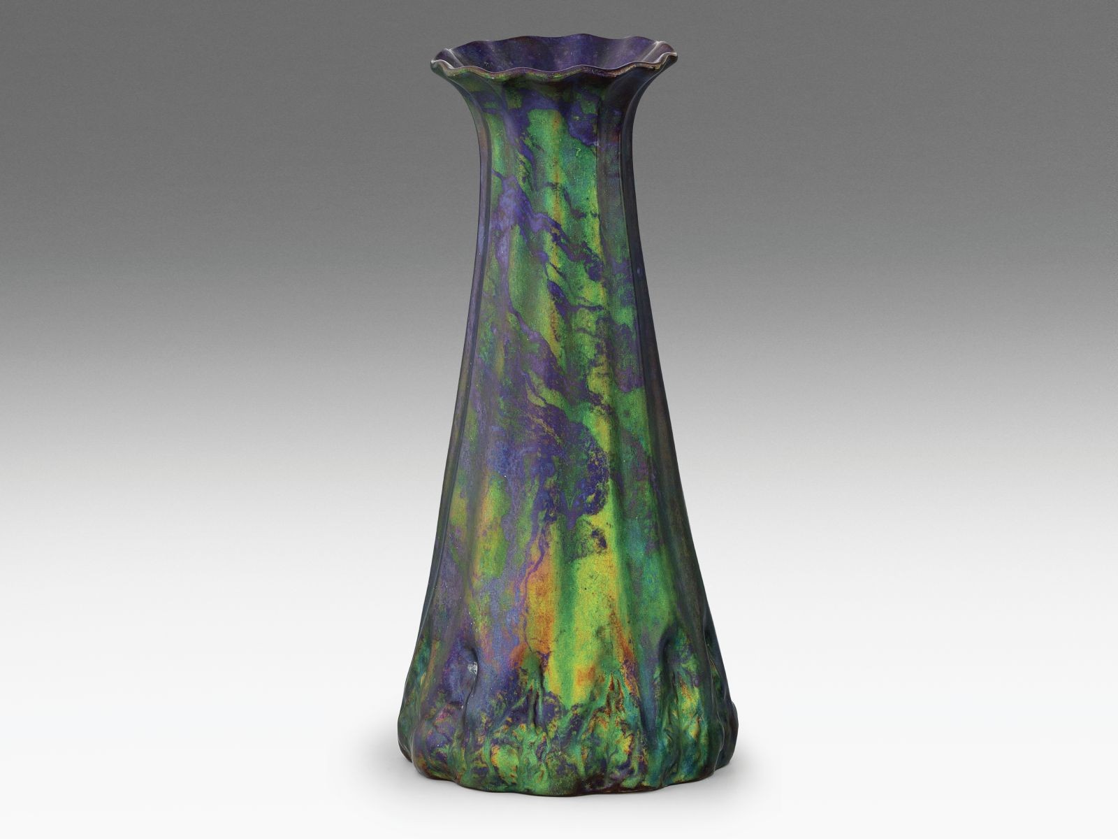 Kikiáltási ár: 50 000 FtFormába öntött fehércserép, felületén selymesfényű, többrétegű, színes eozinmázakkal festve. Formaterv: Sinkó András, 1935. Alján jelzett: bélyegzett hárompajzsos öttornyos márkajelzéssel. Zsolnay, Pécs, 1930-as évek vége. M.: 16 × 8,5 × 9 cm