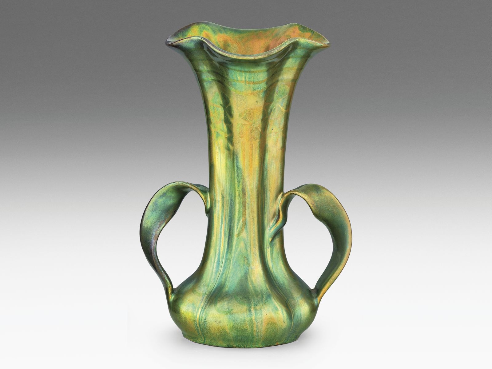 Fehércserép. Öntött, gerezdelt, ill. szabadkézi formázással és ráillesztett, megcsavart szalag fülekkel díszített vázatest. Savmaratott felületén, szecessziós virágdíszek, valamint többrétegű, márványozott eozinmázakkal festve.