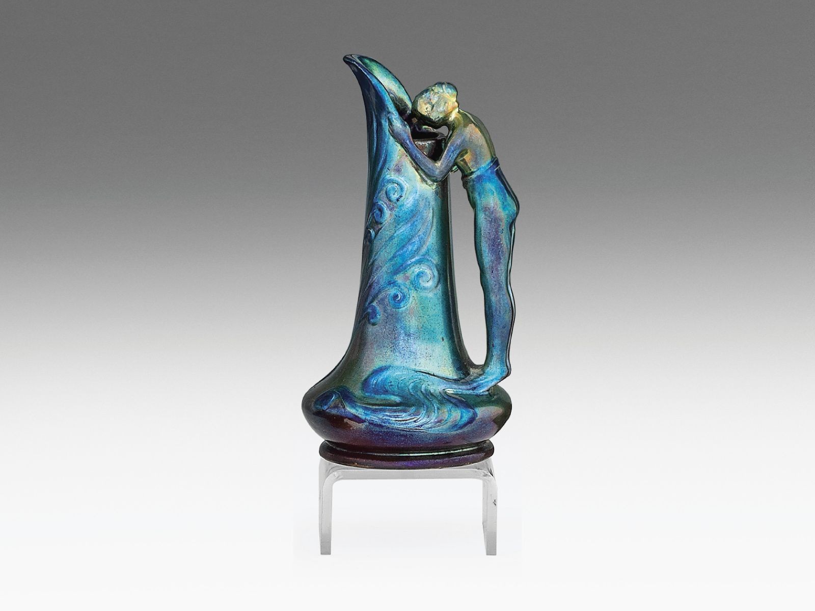 Kikiáltási ár: 140 000 FtFormába öntött fehércserép, felületén selymesfényű, többrétegű, színes eozinmázakkal festve. Formaterv: Sinkó András, 1935. Alján jelzett: bélyegzett hárompajzsos öttornyos márkajelzéssel. Zsolnay, Pécs, 1930-as évek vége. M.: 16 × 8,5 × 9 cm