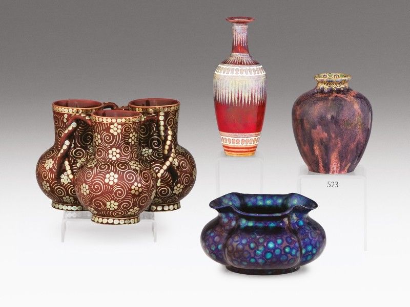 Kikiáltási ár: 75 000 FtKorongozott és kézzel formált, plasztikus elemekkel díszített porcelánfajansz. Tigermázas sárga alapon plasztikus, sárga sárkányalak aranyozva. Restaurált. Alján jelzett: masszába nyomott Zsolnay Pécs és 787 (1882. évi formaszám) és 20. M.: 20 cm Analógia