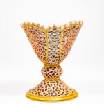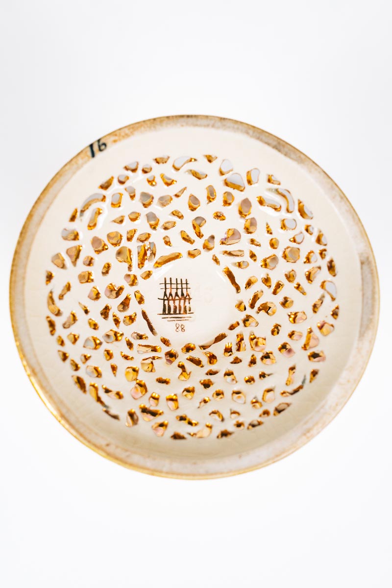 Kikiáltási ár: 60 000 FtZsolnay manufaktúra, 11 x 17 x 11 cm, Porcelánfajansz, korongozással formázott, áttört és diszfestéssel gazdag, 1873 - 1882