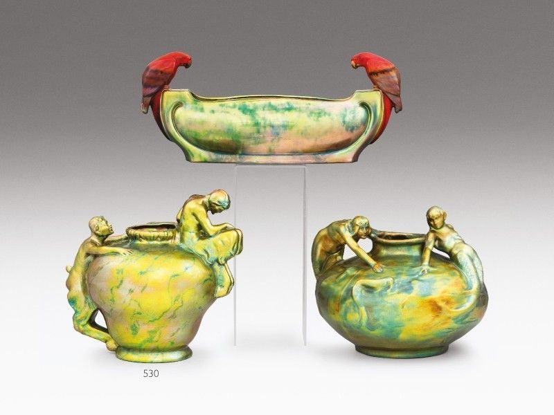Kikiáltási ár: 55 000 FtKorongozott és kézzel formált, plasztikus elemekkel díszített porcelánfajansz. Tigermázas sárga alapon plasztikus, sárga sárkányalak aranyozva. Restaurált. Alján jelzett: masszába nyomott Zsolnay Pécs és 787 (1882. évi formaszám) és 20. M.: 20 cm Analógia