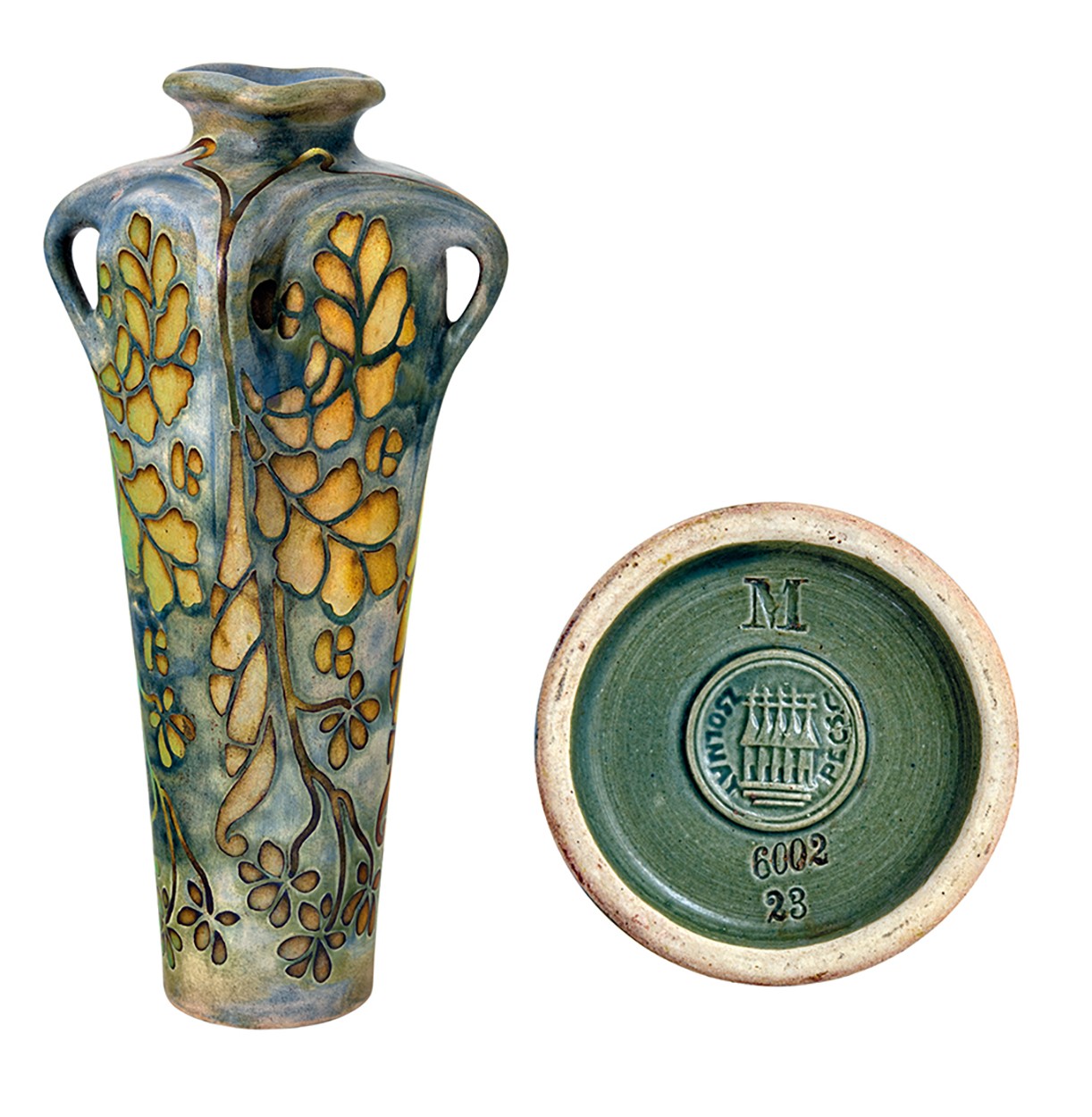 Kikiáltási ár: 750 000 FtFAZONSZÁM: 1088, MAGASSÁG: 35,5 cm, ÁTMÉRŐ: 28 cm, JELZÉS: kobaltkékkel pecsételt TJM családi és masszába nyomott ZSOLNAY PÉCS márkajelzések