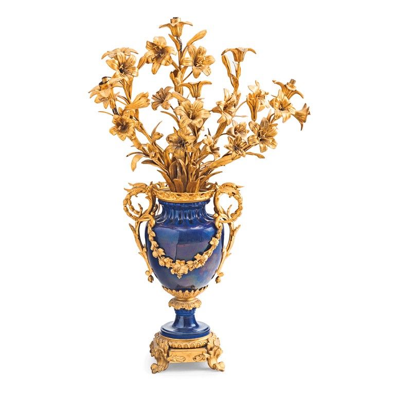 Sevres (?), 19. sz. második fele, kobaltkék festett porcelán test, aranyozott bronz virágcsokor díszítéssel, később lámpává alakítva, sérült, hiányos