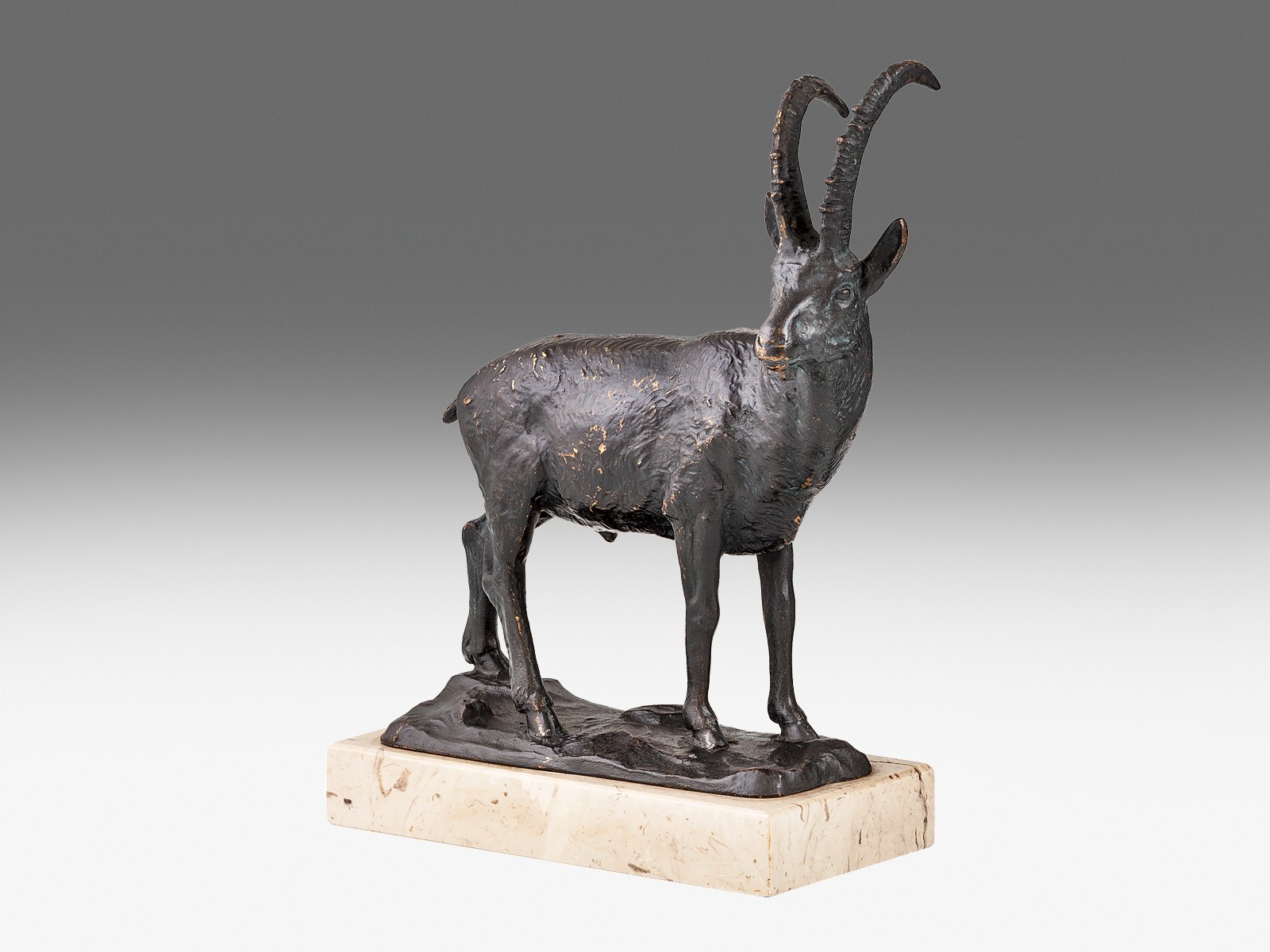 Franz Waldmüller (Bécs, 1894 – ?, 1966) Kőszáli kecske Öntött, patinázott bronz, márvány talpon. Talapzatán jelzett: F. Waldmüller. M.: 16 × 7,5 × 23 cm