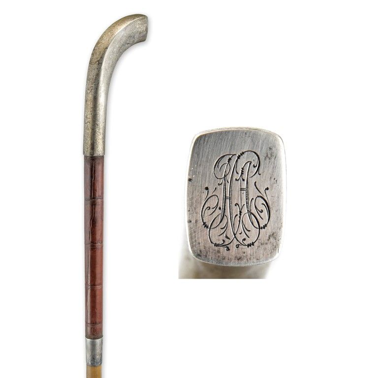 Bécs, 1872-1922 közötti fémjel, 750 ezrelékes kis ezüst és 800 ezrelékes ezüst fogantyú és gyűrű, "J.T" mesterjegy, vésett HA monogrammal, bőrözött nád szárral,