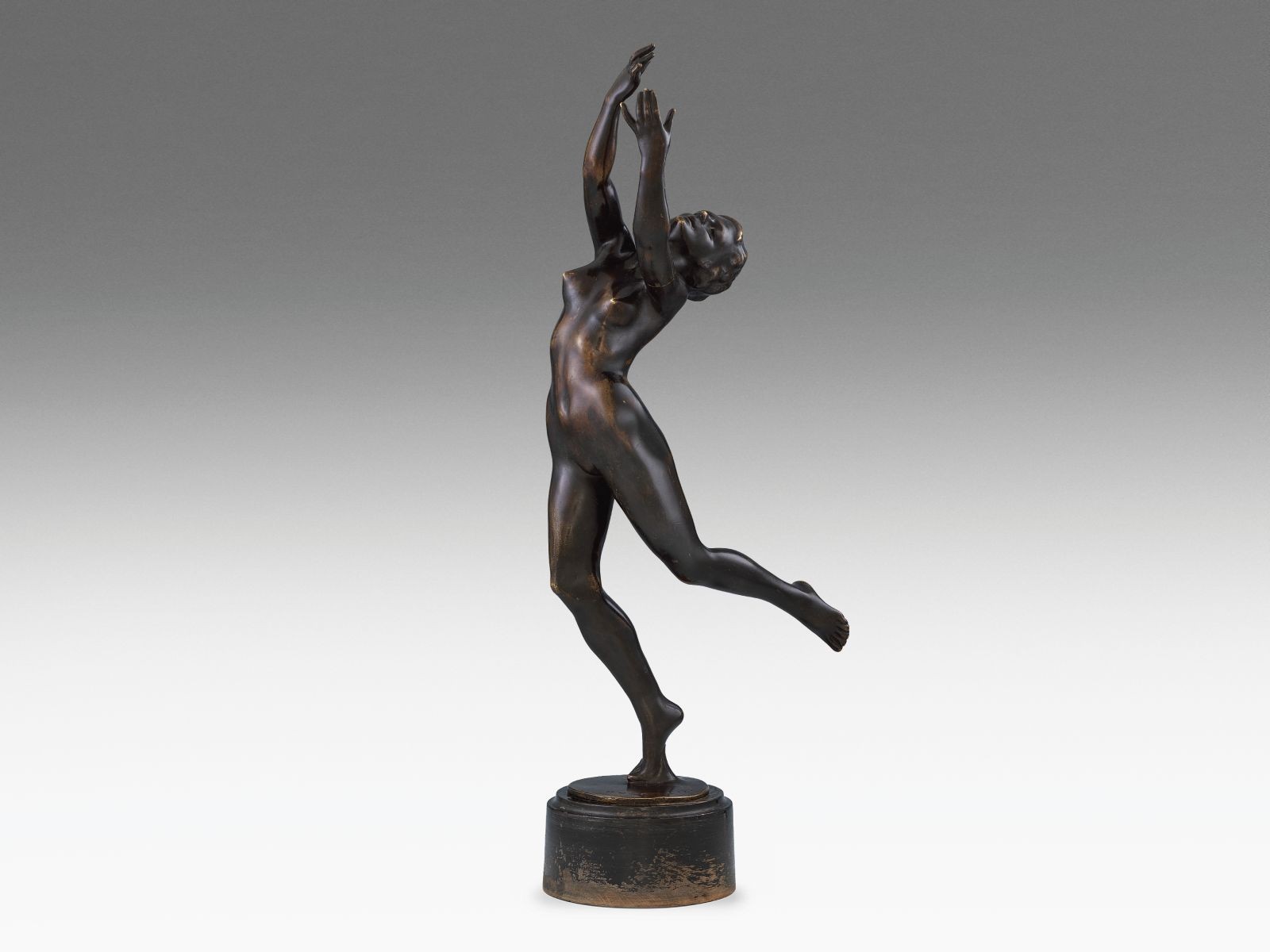 Kikiáltási ár: 1 700 000 FtÖntött, patinázott bronz fa talpon. XX. század. M.: 60 cm