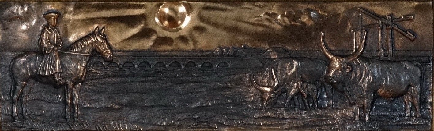 bronz relief, fára applikálva, jjl., 12,5 x 41,5 cm
