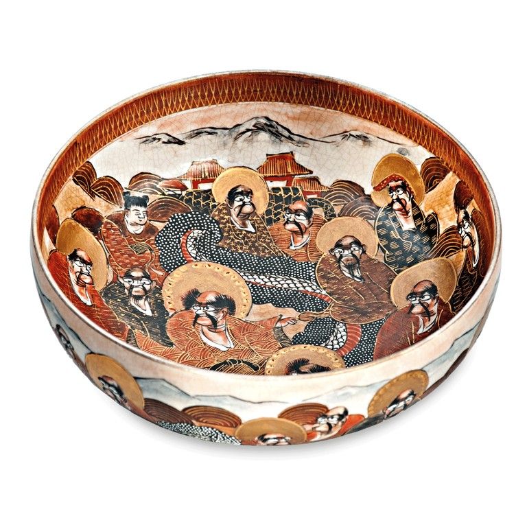 Japán, 19. sz. utolsó negyede, Meiji-kor (1868-1908), festett, aranyozott, satsuma stílusú kőcserép, alján festett jelzéssel, a Megvilágosodottak ábrázolásával