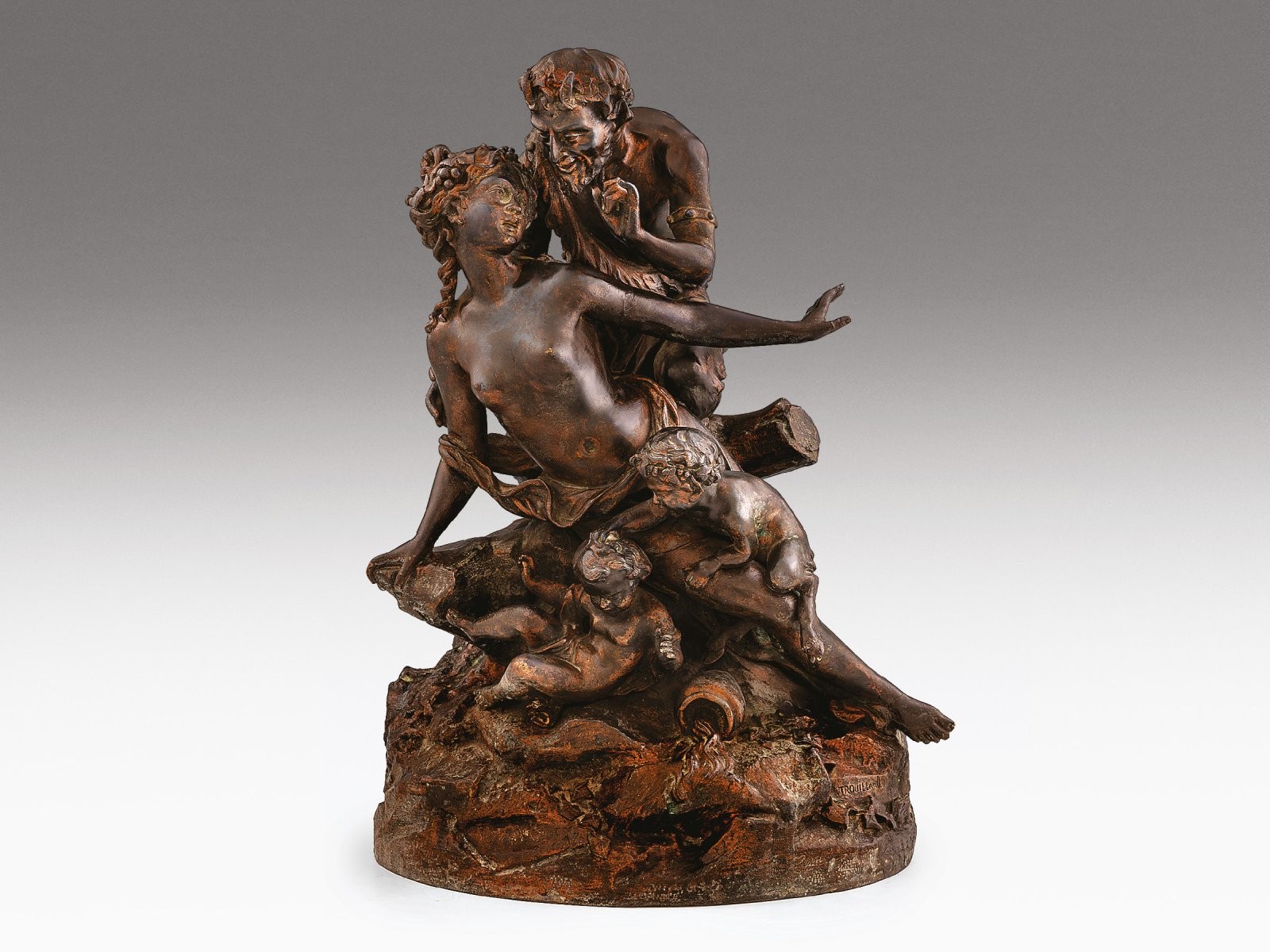 XIX. század végi francia szobrász – Bacchanália Öntött, patinázott bronz. Talapzatán jelzett: Trouillar’d. Gustave Trouillard, XIX. század vége. M.: 48 cm