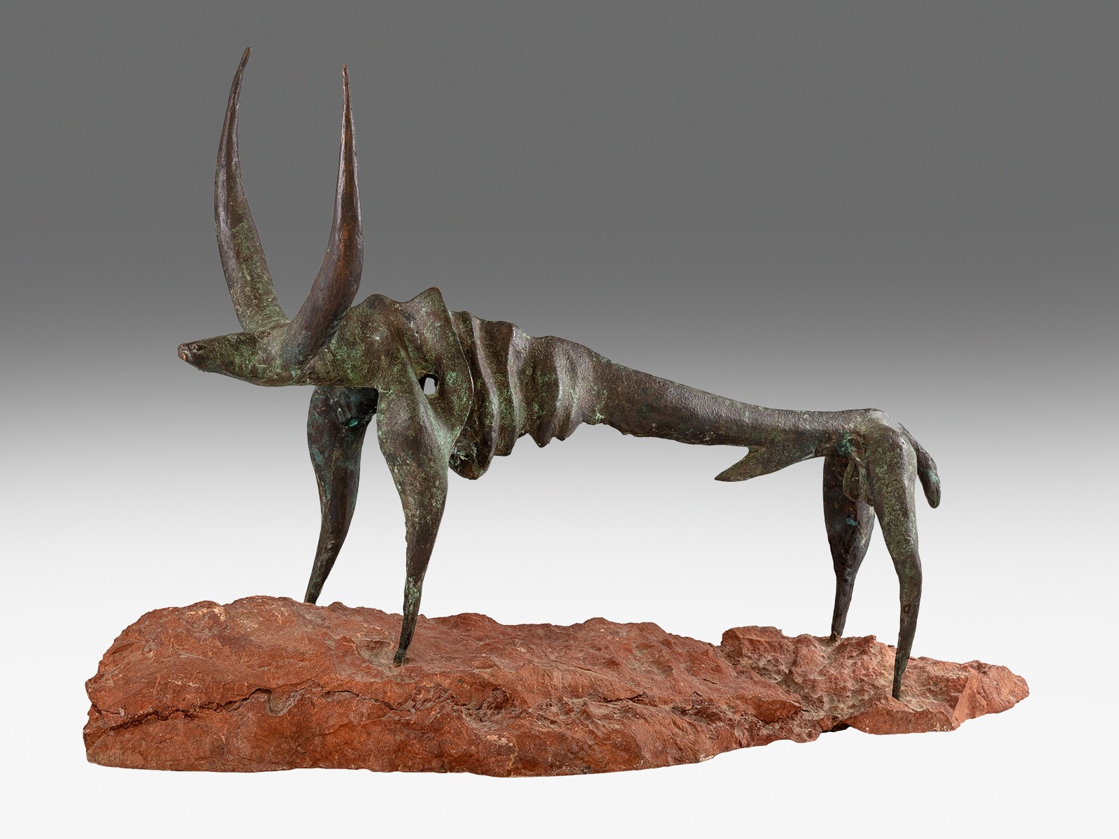 Yengibarian Mamikon (Jereván, 1963) Bika Kortárs örmény szobrász alkotása. Öntött, patinázott bronz. Márvány talapzata sérült. Jelzés nélkül. M.: 53 × 19 × 37 cm