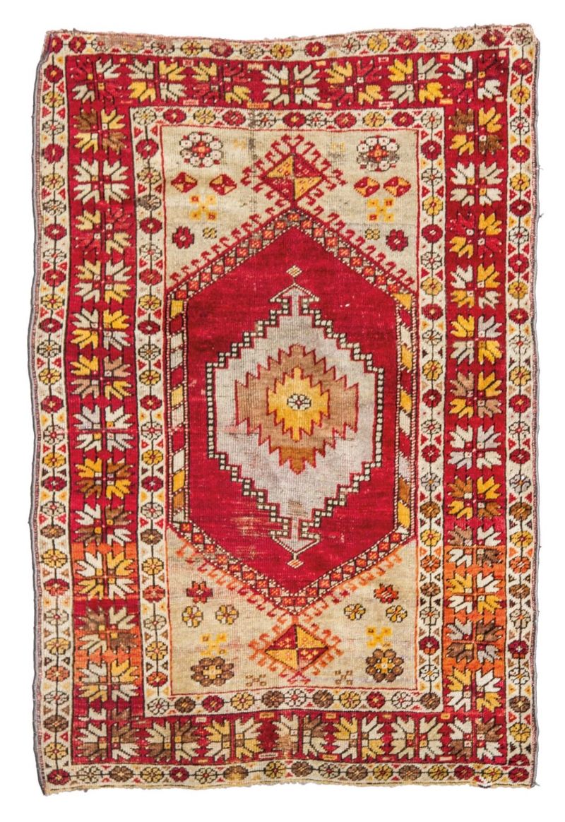 Műtárgy leírás - 1900 körül, gördesz csomózás, kopott, végein hiányos, 106*95 cm