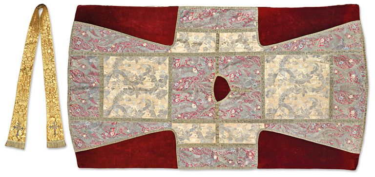 Műtárgy leírás – 19. sz., bársony alapra erősített arany és ezüst szállal hímzett miseruha, stóla későbbi, kis sérüléssel, egykor Tóth János tulajdona a Szent István Bazilikából, Sárdy János operaénekes hagyatékából, 215*118 cm; stóla h: 210 cm