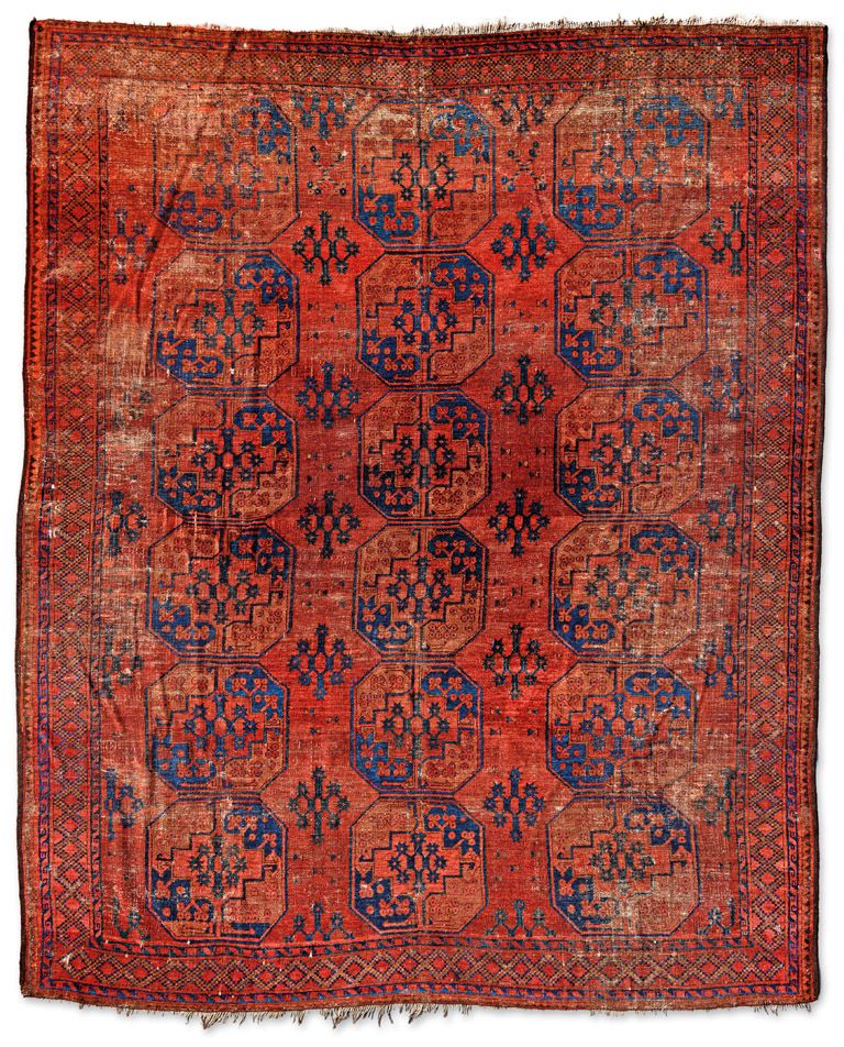 Műtárgy leírás – 1900 körül, szenné csomózás, erősen kopott, 279*229 cm