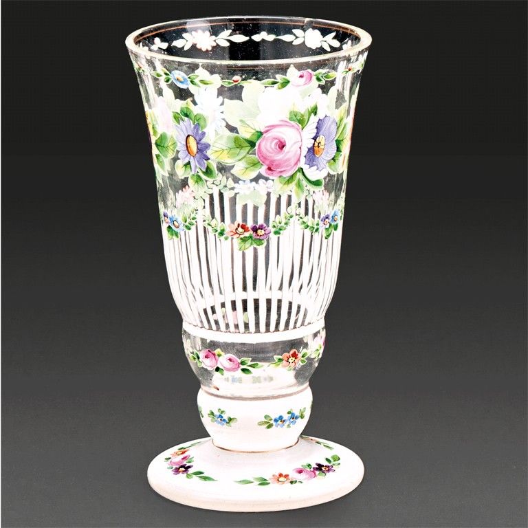 magyar, 19. sz. vége, zománcfestett, aranyozott színtelen üveg, szájperemén kis csorbával