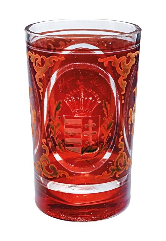 Parád, 19. sz. második fele, bíborpácolt színtelen üveg, zománcfestett és aranyozott díszítéssel, kis karcolással, m: 13,5 cm