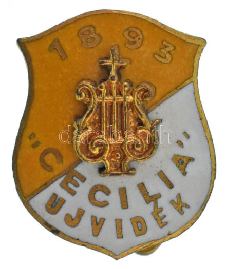 30517. tétel:~1900. "Cecilia Újvidék" zománcozott bronz dalos jelvény (17x14mm) T:AU / Hungary ~1900. "Cecilia Újvidék (Novi Sad)" enameled bronze singing badge (17x14mm) C:AU