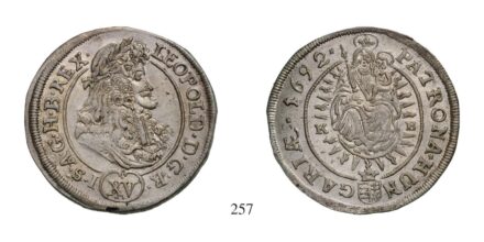 Kikiáltási ár: 0 FtLipót (1657-1705), XV Krajcár /Kreuzer/ , Ag , 1688, Körmöcbánya /Kremnitz/ , mint elôzô, de eltérô rajzolatú /wie vorher, aber anders gezeichnet/ Av: LEOPOLD•D•G•R•I•-•S•AvG•H•B•REX• , Rv: PATRONA •HUN-GARIAE•1688•-+- kétoldalt verdejegy /zur Seite Mzz./