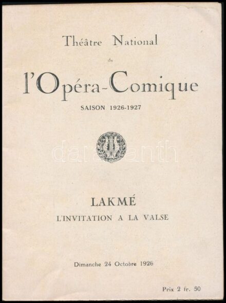 16647. tétel:1926 Théátre National de l'Opera-Comique Saison 1926-1927. Lakmé l'invitation a la valse. Paris, 1926, Willy Fischer. Franica nyelven. Fekete-fehér illusztrációkkal. Kiadói papírkötés. + Egykorú színházjeggyel.<a href="https://www.darabanth.com/hu/g