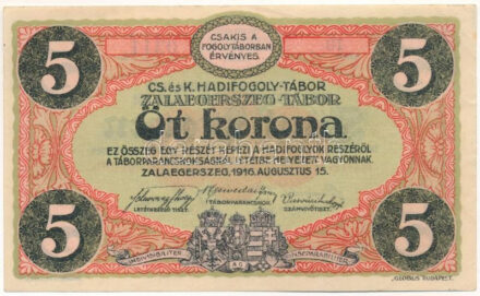 30643. tétel:Zalaegerszeg / hadifogolytábor 1916. augusztus 15. 5K arab sorozat és sorszámmal, "10 0311" T:AU / Hungary / Zalaegerszeg / POW camp 1916.08.15. 5 Kronen with arabic serial numbers, "10 0311" C:AU Adamo HHZ-1.6V